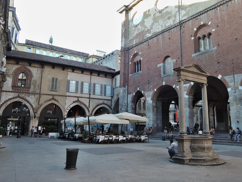 | Pri odchode som si spomenula, že po obede sme sa zabudli zastaviť na malom romantickom nádvorí Piazza Mercanti, ktoré bolo v stredoveku, pred vznikom Dómskeho námestia, centrom Milánskeho života. Tu sídlil súd, väznica, tu sa v mestskej sále konali trhy i svatby ... a teraz je to malinké námestie, ktoré prehliadnete za nevkusnými schodami ...
